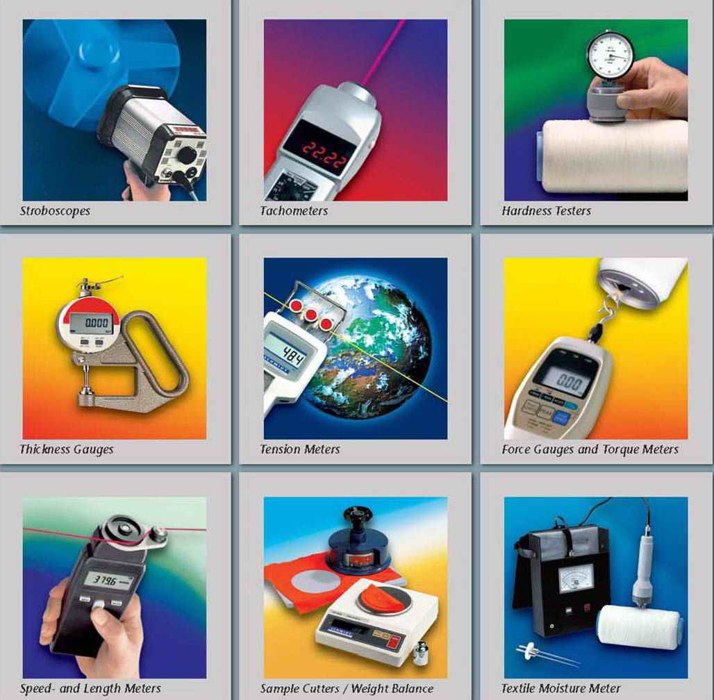 انواع تنشن متر و لوازم عمومي آزمايشگاه مثل استروبوسكوپ ، دور سنج ، سنجش سرعت و متراژ نخ ، رطوبت سنج شاخكي ، ضخامت سنج عقربه اي و ديجيتالي ، نيروسنج ، گشتاور سنج ، و ساير دستگاههاي كنترل كيفيت
